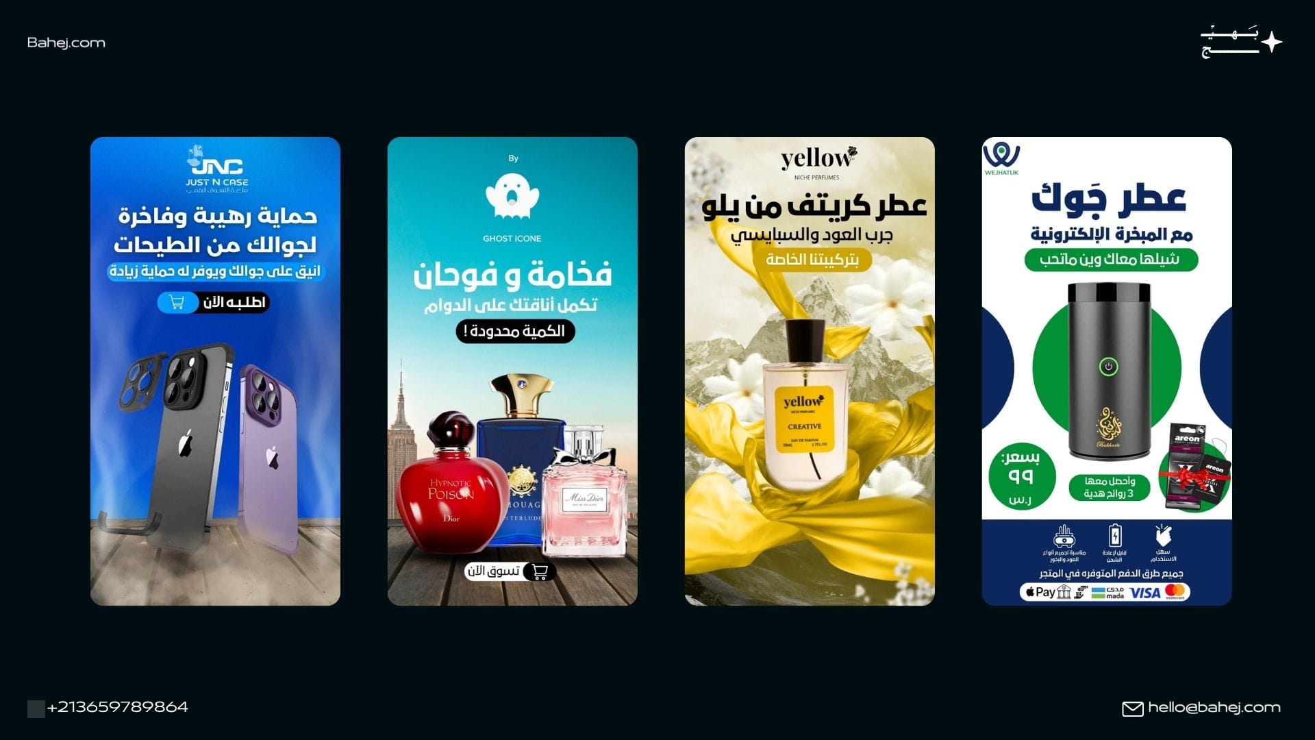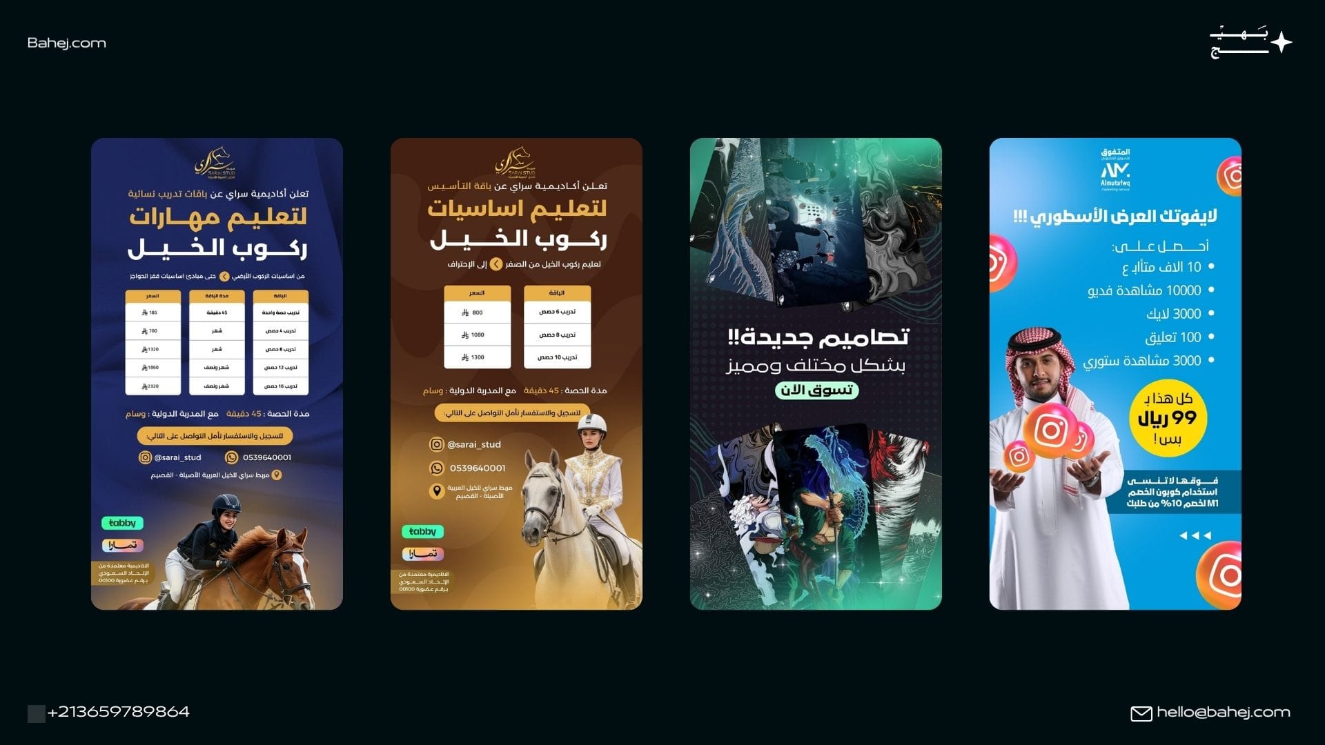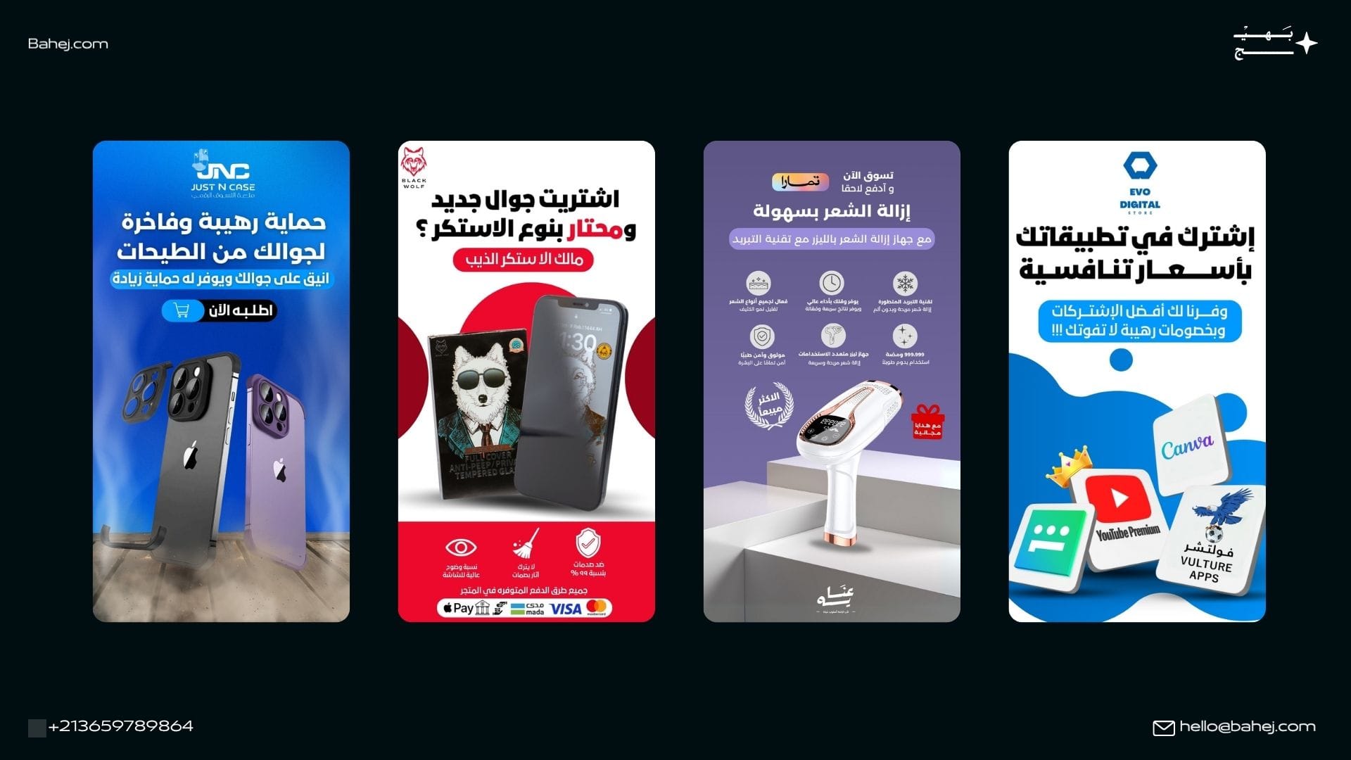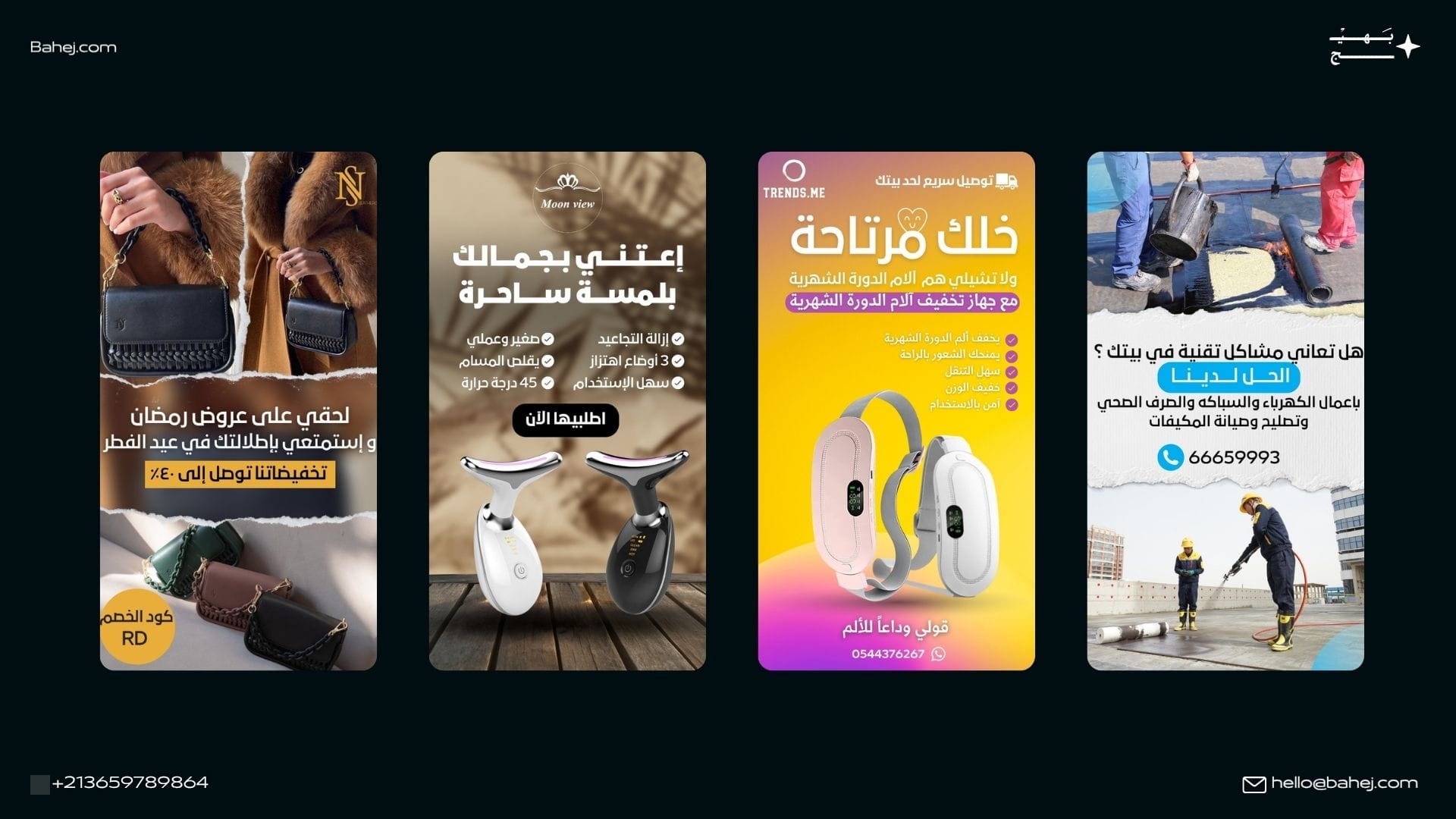احصل على أفضل تصميم إعلانات لسناب شات وتيك توك وريلز وانستقرام معنا في Bahej، إذ اننا نقدم خدمة تصميم إعلانات سوشيال ميديا باحترافية عالية لكل صاحب عمل ومتجر يبحث عن جذب العملاء وزيادة المبيعات.