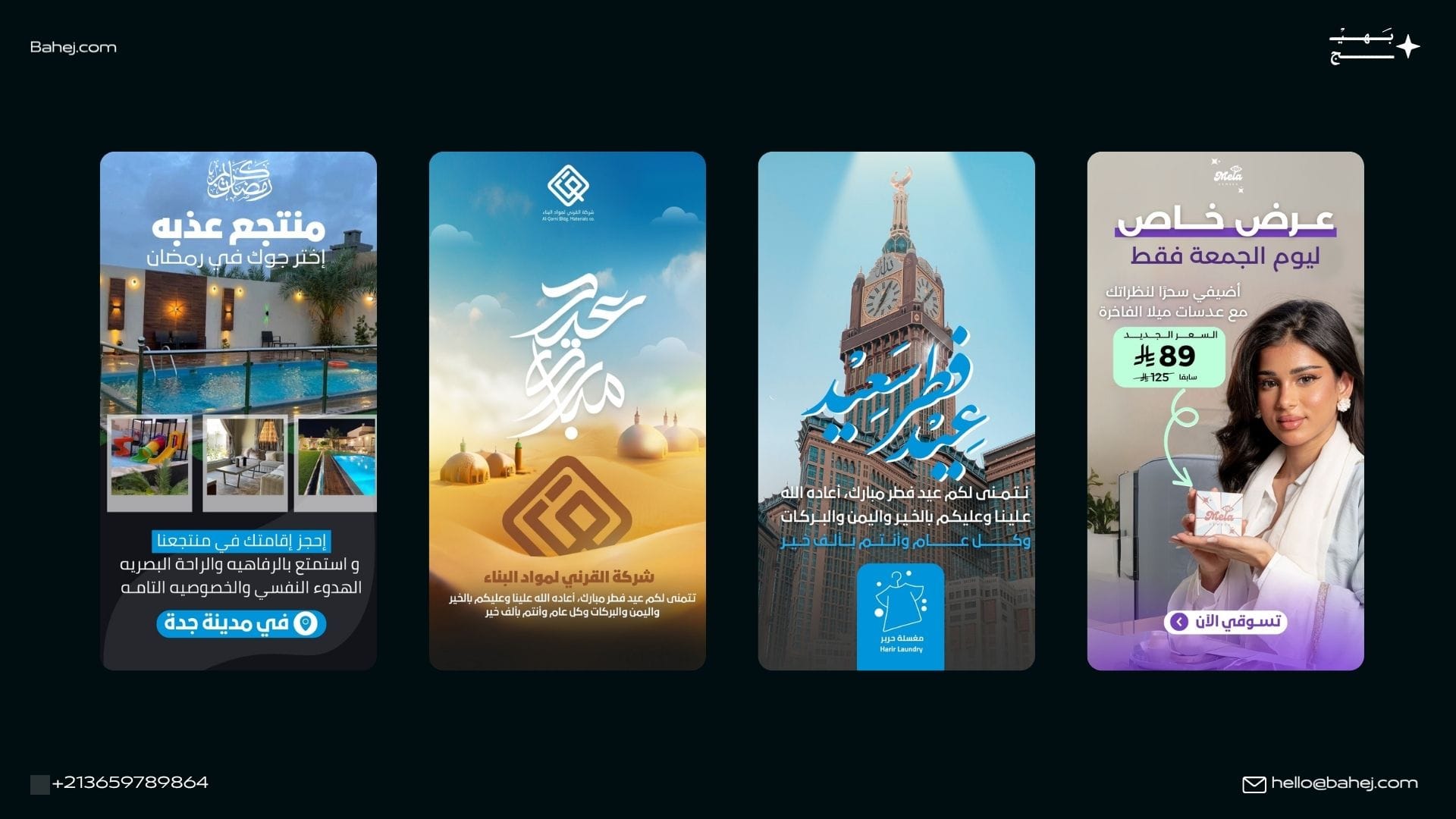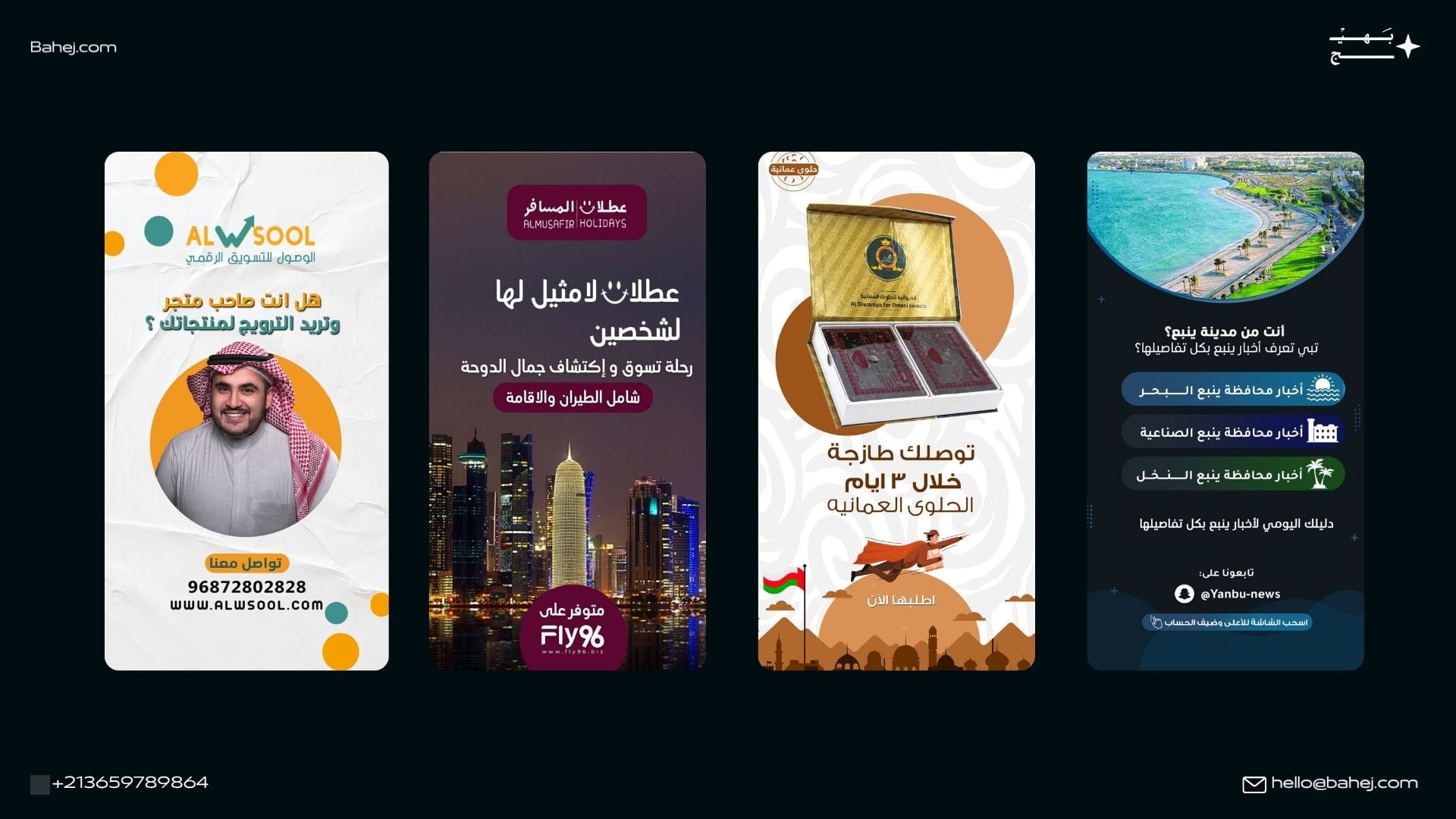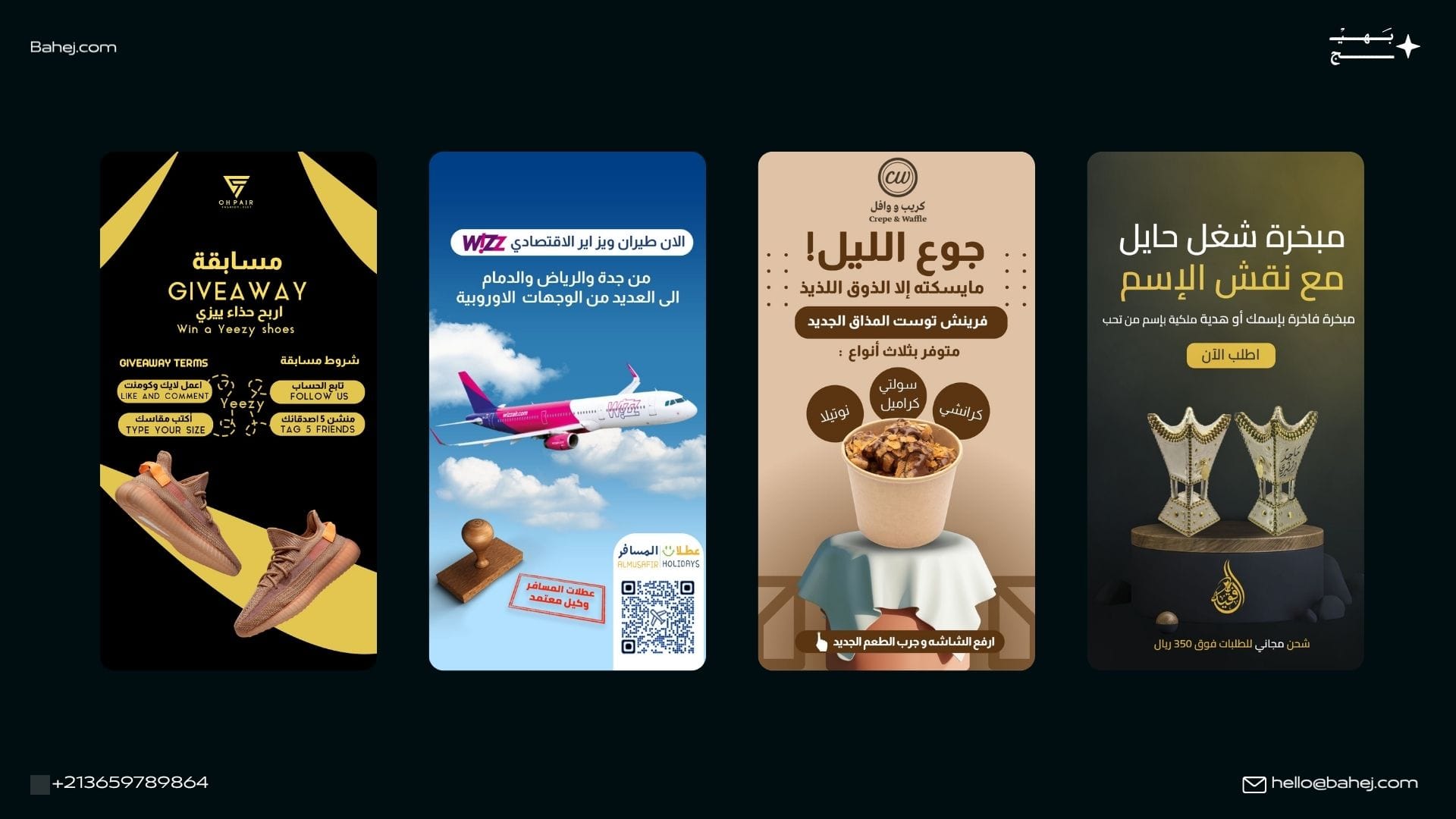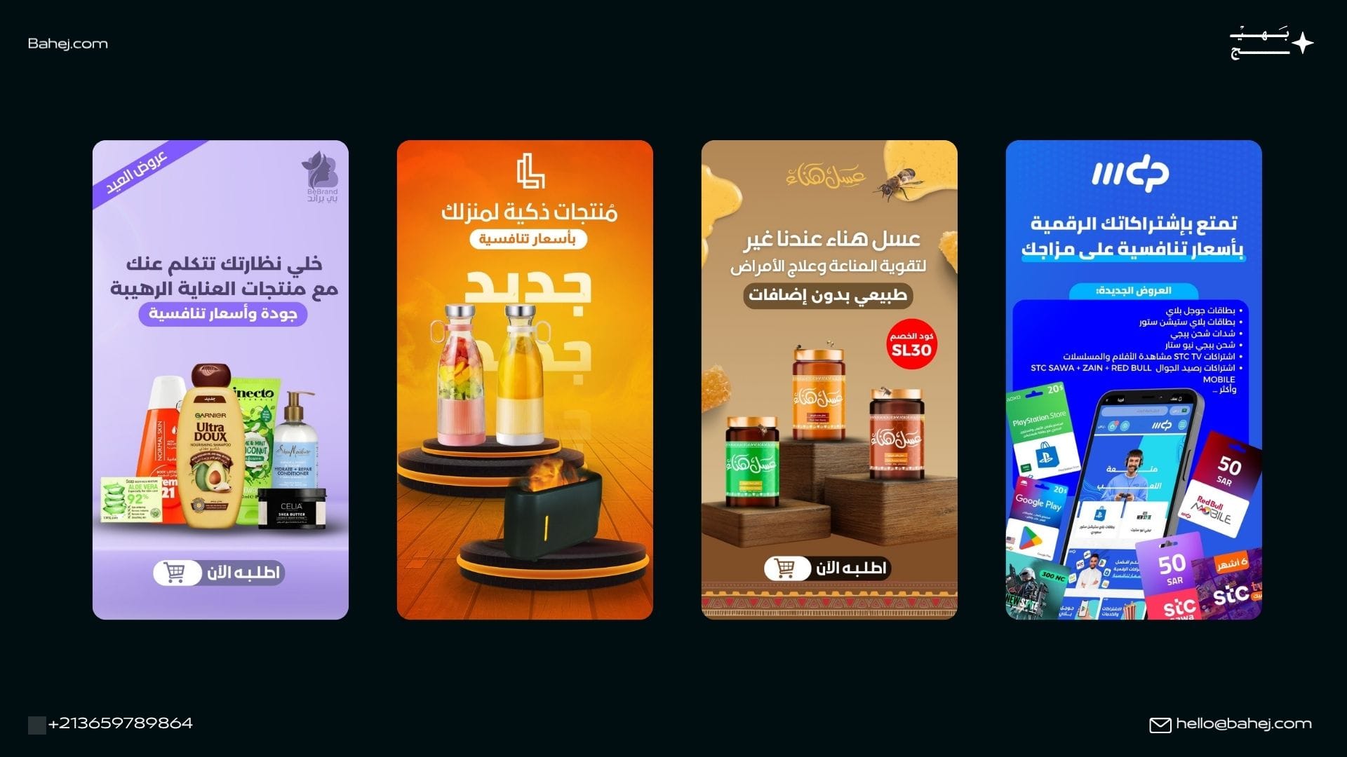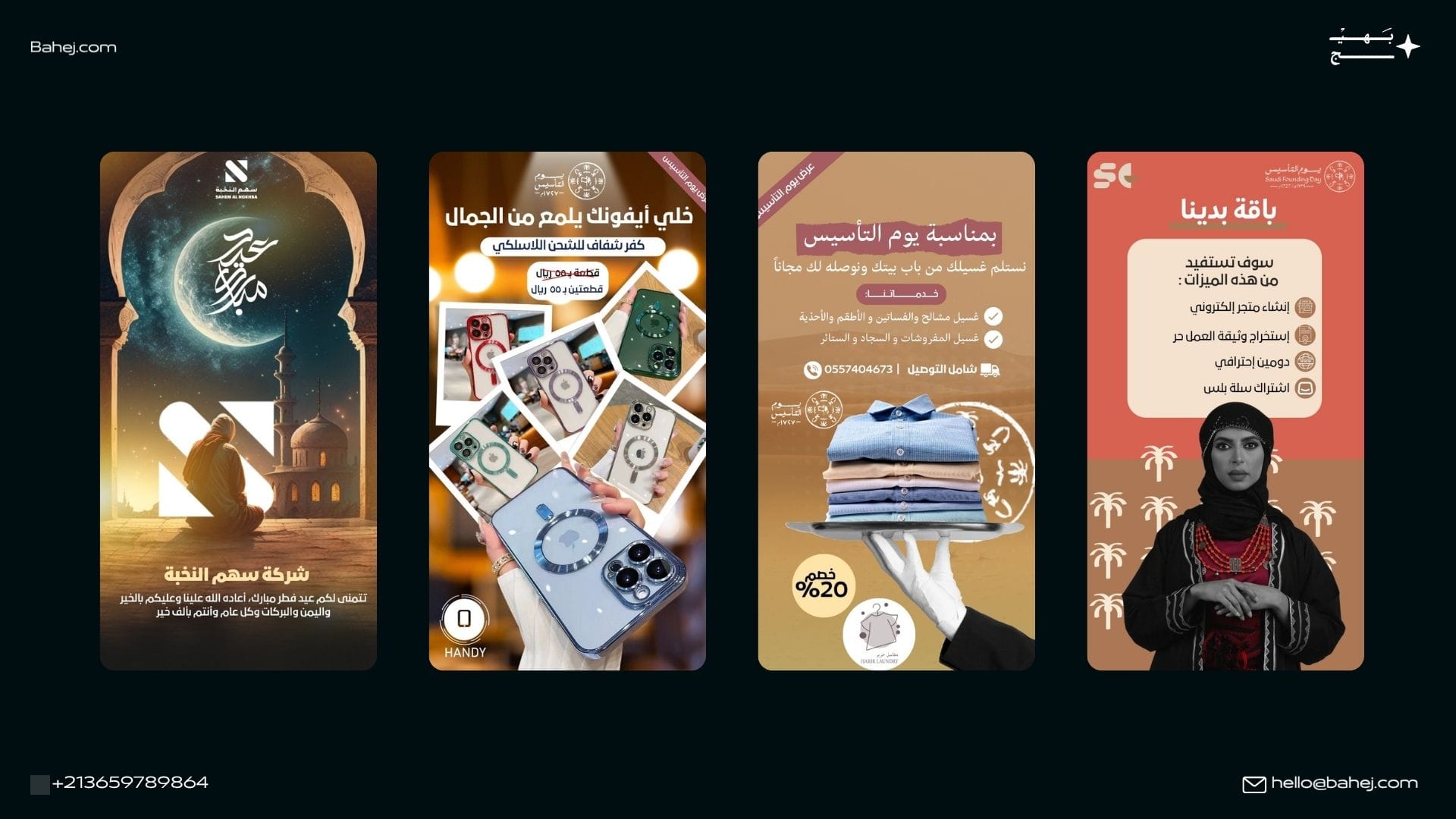 احصل على أفضل تصميم إعلانات لسناب شات وتيك توك وريلز وانستقرام معنا في Bahej، إذ اننا نقدم خدمة تصميم إعلانات سوشيال ميديا باحترافية عالية لكل صاحب عمل ومتجر يبحث عن جذب العملاء وزيادة المبيعات.